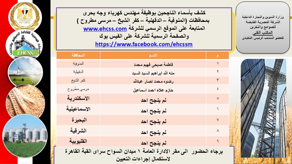 اسماء الناجحين بوظيفة مهندس كهرباء بمحافظات (المنوفية – الدقهلية – كفر الشيخ – مرسى مطروح )